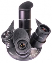 Baader Q-Turret Quadruplet 1,25" Okularrevolver ohne Okulare. Der Baader Q-Turret Okularrevolver ermöglicht den Wechsel von Vergrösserungen binnen Sekunden und bietet vier 1,25" Anschlüsse. Sie können bis zu vier Okulare aber auch statt eines Okulares eine Kamera verwenden. Fernrohrseitig hat der Okularrevolver ebenfalls einen 1,25" Anschluss. Sie können den Revolver daher direkt an 1,25" oder 2" Zenitspiegel anschließen und durch die kurze Bauweise sogar an Newton Teleskope mit genügend Fokussierweg. Für Mond- und Planetenfotografie: Wechseln Sie von der Beobachtung zur Fotografie binnen weniger Sekunden. Damit können Sie optimales Seeing abwarten und effektiv fotografieren. Mit dem optionalen Parfokalring können Sie sogar die Fokusposition von Kamera und Okular optimal aufeinander abstimmen. Durch die kompakte Bauweise ist der Okularrevolver auch an den meisten Newton Teleskopen mit 2" Okularauszug verwendbar. Die Bildorientierung wird nicht verändert.